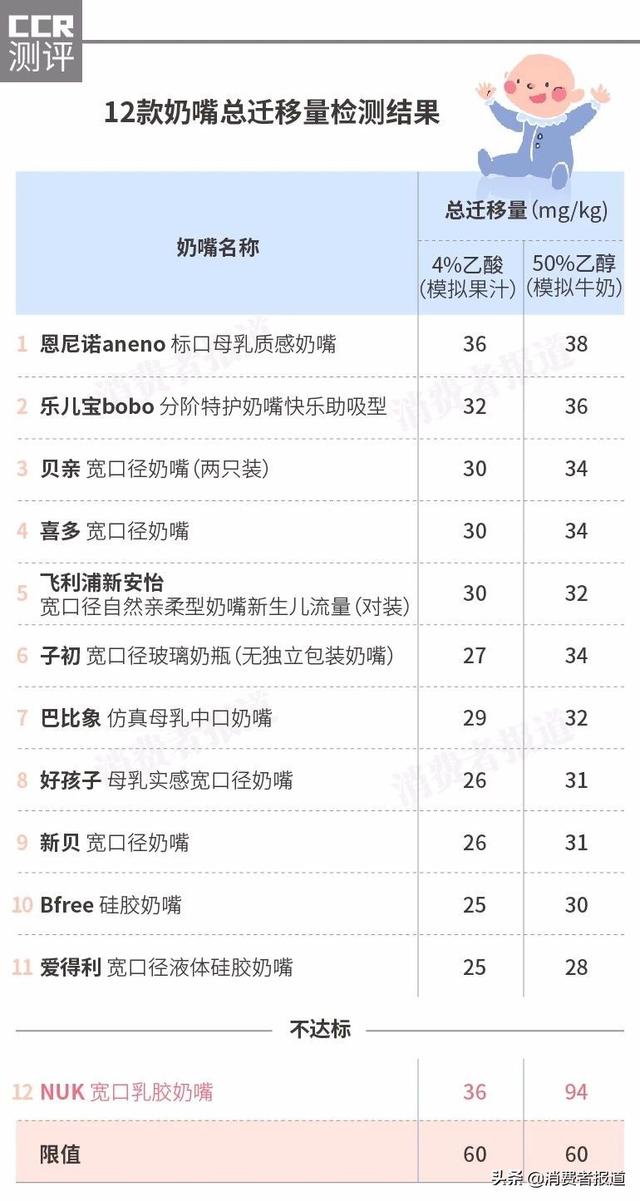 NUK广口乳胶奶嘴在50%乙醇液体中的总迁移量为94 mg/kg,超过国家标准要求,属于不合格产品。它的配套瓶名是NUK耐高温广口玻璃彩瓶。