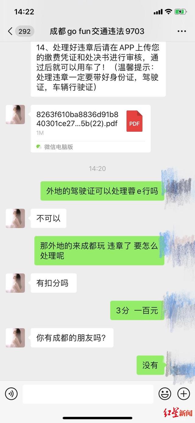 记者联系成都当地违章专员后,违章专员发来了一份题为《自行处理交通违章及融E行网上预约步骤》的处理流程说明。而外地驾照无法处理荣e线上的违章,需要预约窗口处理。违章专员说,一个人出门在外,可以选择公司处理。“如果扣3分,罚100元,公司需要800元处理,扣罚都包含。”
