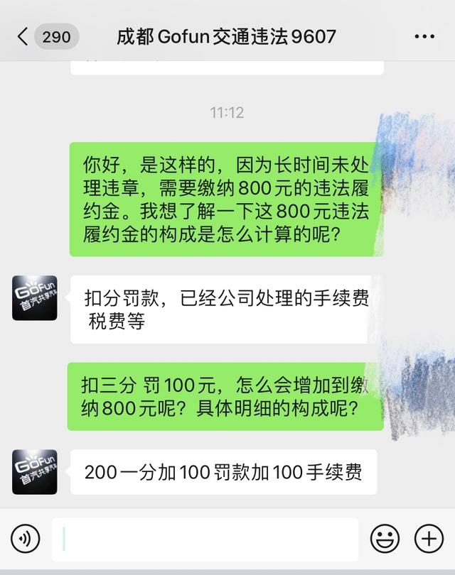 于是,今年6月收到律师函后,想起此事的林先生联系了GoFun的工作人员。在林先生提供的聊天记录中,记者看到,林先生询问违章是否可以网上处理,工作人员回复:“车辆已经年检,违章公司已经处理了,你只能交违章绩效款。”