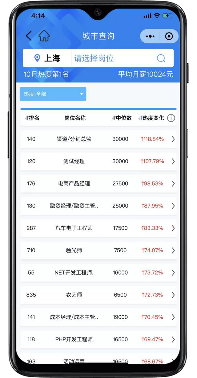 10月份数据显示,上海地区渠道/分销总监薪资中位数大幅增长,从9月份的2.5万元增长到3万元,招聘热度增长118.84%,从第409位上升到第140位。
