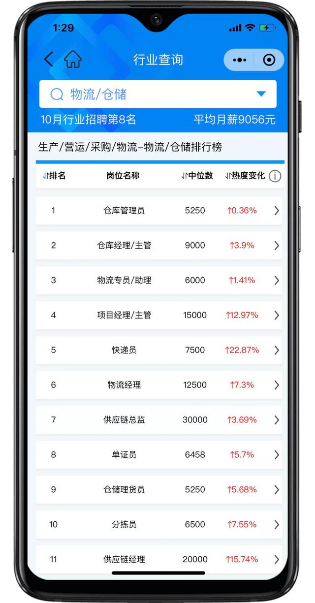 从10月份师旷薪酬大数据可以明显看出,物料/仓储行业招聘热度整体呈上升趋势,其中快递员岗位招聘热度极为明显,热度上升22.87%。