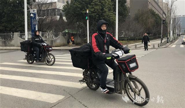 快递员在寒风中的武汉街头忙碌。
