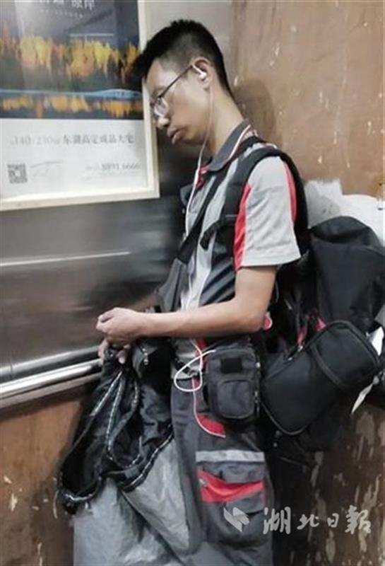 “今天下午在电梯里,发现快递小哥站在电梯里睡着了,捅了他两下,他就醒了……”