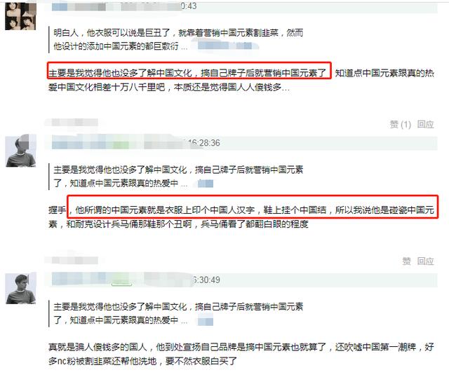 此外,陈冠希长期以来倡导的中国风也受到了批评。有网友认为他不太了解中国传统文化。虽然他的品牌一直在营销中国元素,但是很敷衍。国风的所有元素都是用汉字、中国结等元素维持的,没有设计理念。