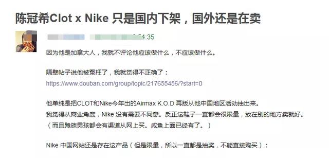 部分网友本着客观评价的态度,对陈冠希下架联名产品的行为进行了严谨求证。结果,陈冠希的牺牲没有那么大,一切只是一个商人的行为。这款联名鞋只在中国大陆、中国、港澳台以及海外地区下架,耐克中国网站上仍有这种联名鞋。据说因为是限量产品,只能抽奖购买。
