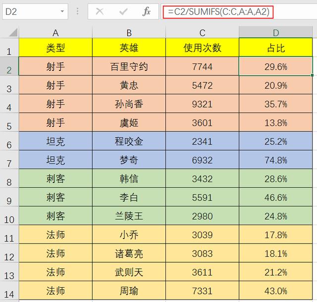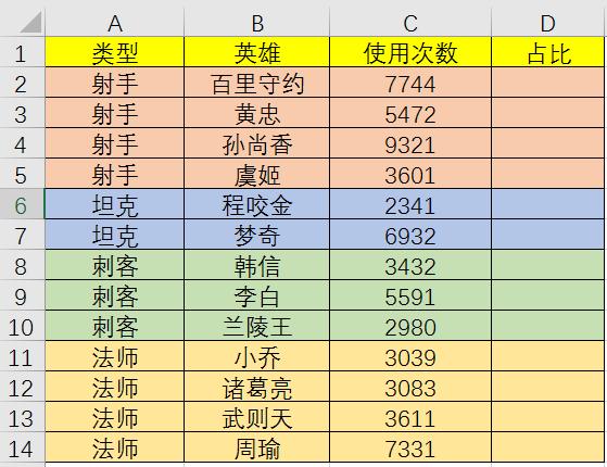 以上只是最简单的计算百分比。如果遇到下表,需要计算每个英雄在每个类型中的使用比例