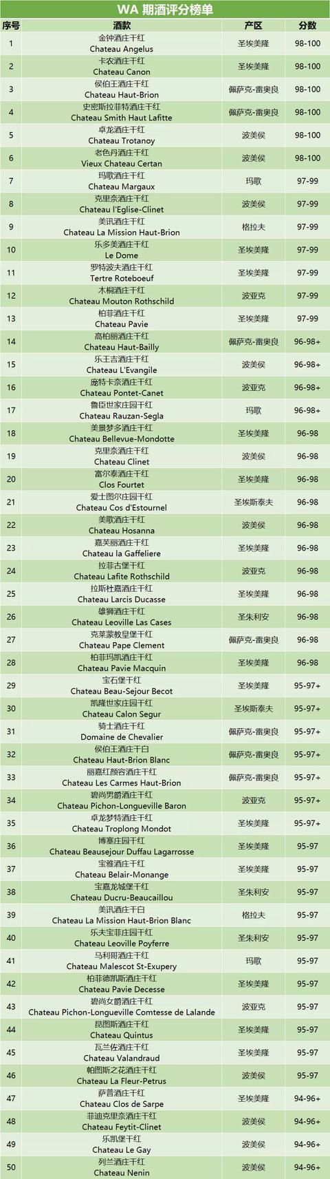 我们来看看接近满分(都是98-100分)的前六名葡萄酒。