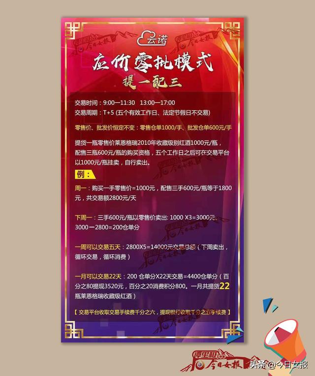 “云诺现货价格零批模式:充值2800元成为经销商,可获得原价600元/瓶的莱恩格力2010珍藏级红酒4瓶,其中1瓶留给自己,另外3瓶可在‘云友’APP交易平台以1000元/瓶出售。”
