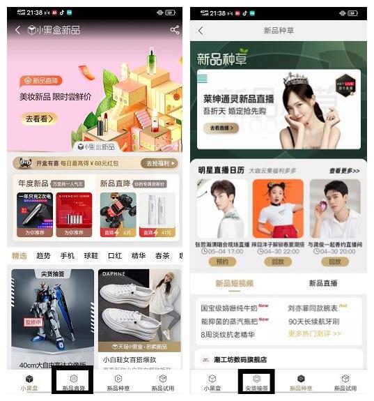 对比:天猫的页面更加规范,各个模块的观感相对统一;JD。COM的页面有很强的宣传风格,轮播地图和超级新一季颜色鲜艳,轮播登陆页面也是很强的主题风格。小黑盒页面在淘宝和天猫app略有不同。在天猫app点击【新品种草】,底部导航第二位会从【新品直投】变成【尖货抽奖】。