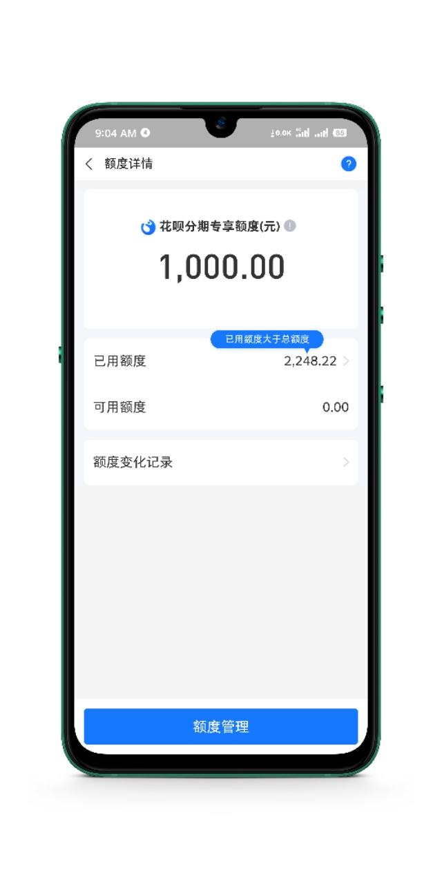 我的分期额度一直是21000元。上个月底,我买了一部手机,花了2000多。我觉得可以用花呗免息分期,所以分了六期。