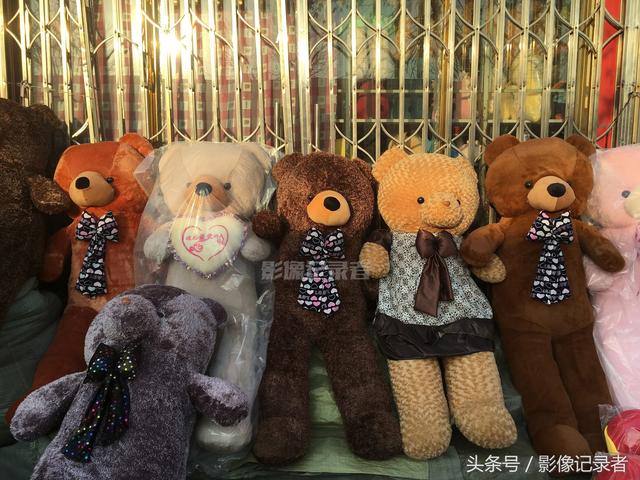 在批发市场的街上,一家毛绒玩具店前摆着一排毛绒玩具熊,供客人挑选。这里的价格都是批发价,一般比市面上的便宜几块到几十块。