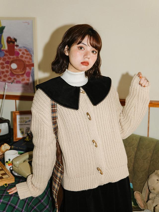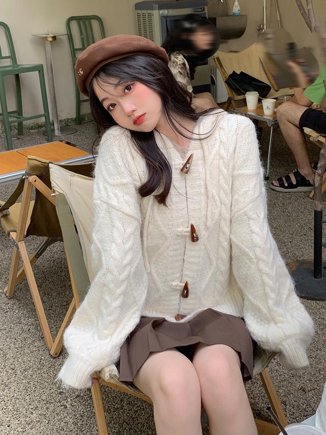 奶白色牛角扣毛衣,真的很可爱。