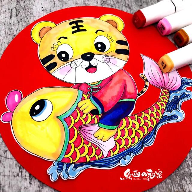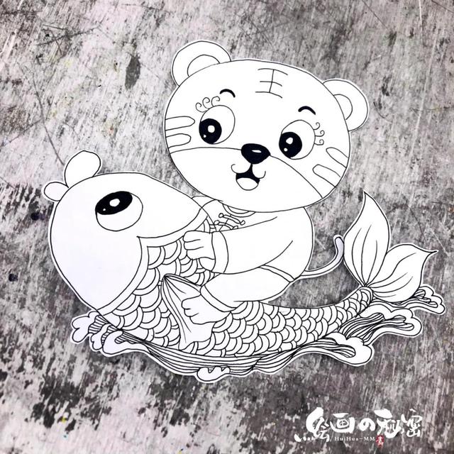 第一步:孩子心目中的老虎形象是什么?是可爱的,萌萌的,漂亮的还是帅气的?作为吉祥的象征,锦鲤鱼,你看,在这个2022年的新年,锦鲤鱼带着一只小老虎来了。接下来就用黑勾线笔来画吧~这里要注意处理好它们之间的遮挡关系!