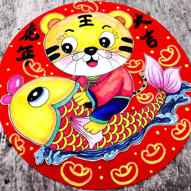 第三步:接下来,我们用黑色勾线笔在背景上书写:类似“虎年大吉”、“虎年大吉”、“虎年快乐”等新年字样,让画面的主题更加鲜明,并用彩色金属笔为画面增添丰富的新年元素背景:例如,小红包、小元宝、小金币等。