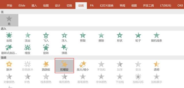选择滚轮,进入【动画】选项卡,添加【强调动画-陀螺旋】。