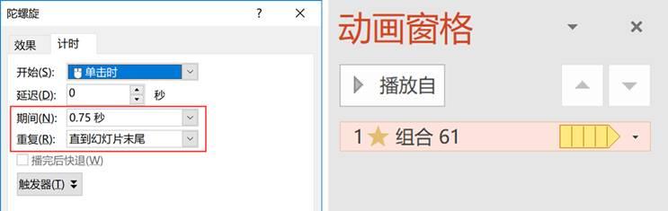 默认的“陀螺旋”动画只会旋转360°,旋转速度较慢,需要调整。双击动画窗格中的动画进度条,打开“陀螺旋”设置窗口,选择“计时”选项卡,将“周期”改为“快”,“重复”改为“直到幻灯片结束”: