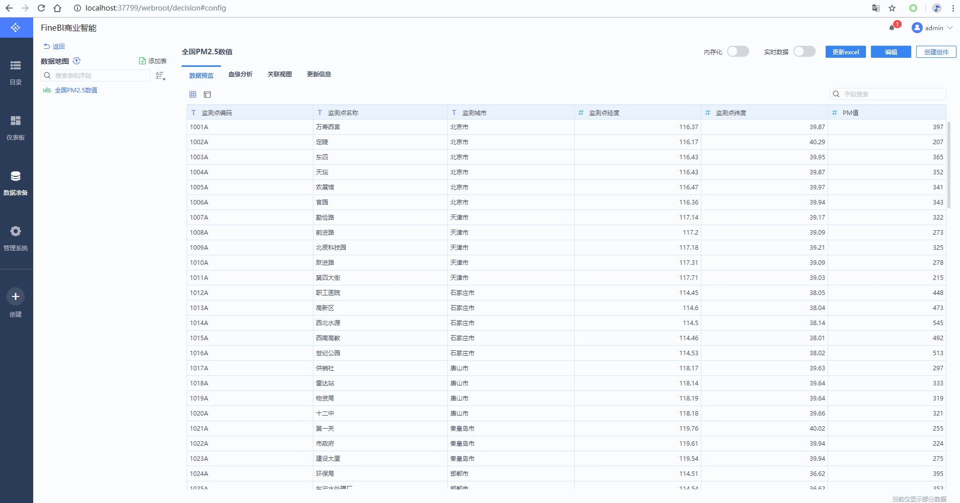 选择数据准备-点击添加业务包-点击业务包下的添加Excel-将全国各城市PM2.5数值的Excel导入FineBI。
