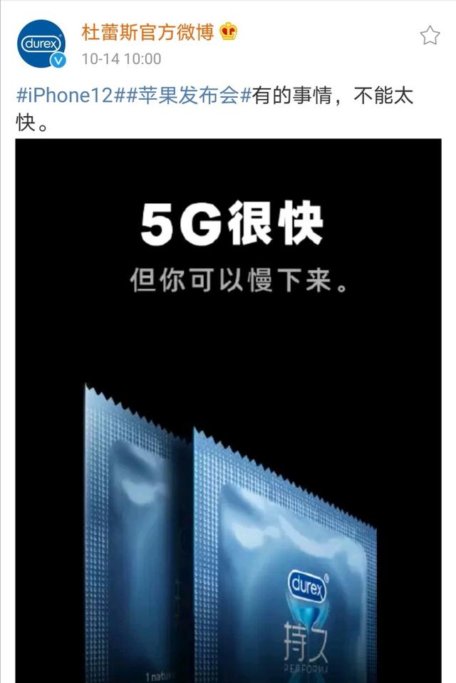 最经典的是杜蕾斯在20年10月iPhone 12发布会当天,先于其他自媒体发布了该微博。