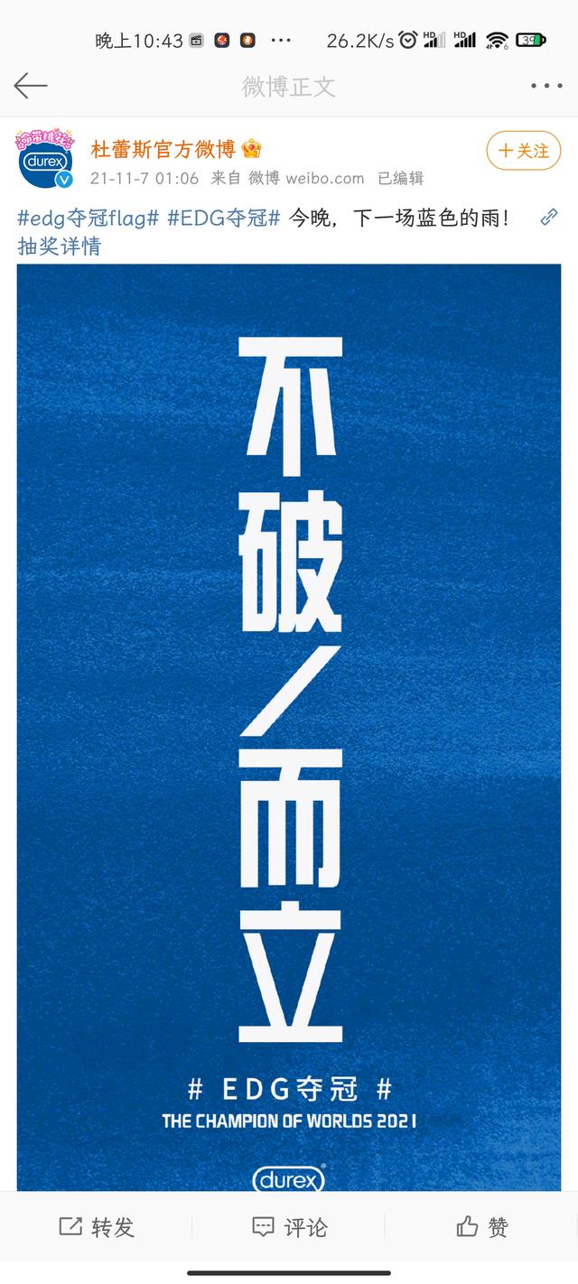杜蕾斯的官方微博现在有300多万粉丝,是世界知名的性用品品牌。但由于我国相关规定,杜蕾斯一直无法利用公共媒体进行宣传。微博的出现为杜蕾斯提供了新的途径。杜蕾斯的微博营销在业内独树一帜,充满了独特的营销手段,使其成为网络营销的行业领导者。新闻和热点事件发生时,杜蕾斯永远是反应最快的,杜蕾斯的营销不需要长篇大论。它只需要短短的几个字和一张制作精良的图片,就能整合其产品的特色,引起大众的关注,强化消费者对其产品的印象,获得大量转发。比如杜蕾斯去年为了庆祝edg夺冠自己做了营销。