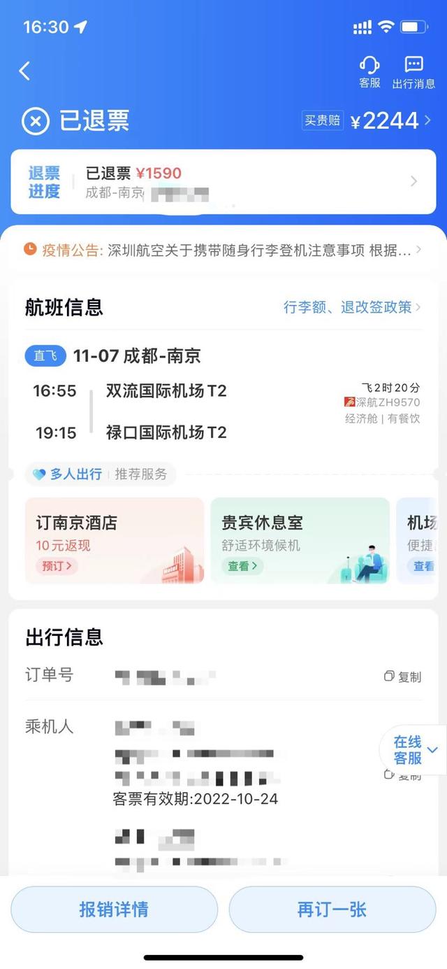 徐先生介绍,他原本打算今年11月初去成都看一场演唱会,于是在10月24日在知行火车票APP上花了2244元购买了两张11月7日从成都到南京的深航空的机票。之后由于疫情严重,演唱会也取消了。10月30日,徐先生在知行APP上退了两张机票,退款1590元,两张机票手续费654元。