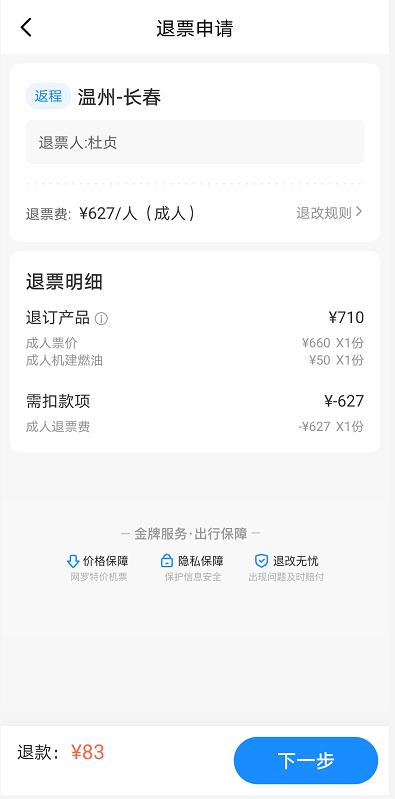 考虑到疫情风险和后续个人安排,小杜决定退机票。8月1日,小杜在知行APP上操作退票时,长春到温州的退票费为390元,但返程退票费却高达627元。小杜很疑惑。她认为退款应该是因为疫情减少了手续费。她的往返机票总共710元(包括50元的机场建设费)。如果扣除627元,660元里的退票手续费高达95%,这让小杜无法接受。她认为这不合理。