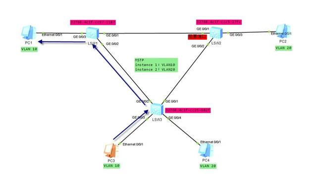 [SW3]stp区域-配置//激活SMTP域配置 [sw3-MST-region]区域-名称华为//设置SMTP域名 [sw3-MST-region]实例1 VLAN 10//划分VLAN 10到实例1 [SW3-MST-region]实例2 VLAN20//划分VLAN 20到实例2 [SW3-MST-region]活动区域-配置//激活MST域的配置 [中