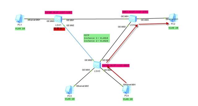 [sw2] dissp实例1b brief//检查实例1中的端口状态 ms tidport角色STP状态保护 1千兆以太网0/0/1根转发none 1千兆以太网0/0/2 Desi丢弃None//阻塞端口 [SW2] 12345对于实例1的分组通信过程