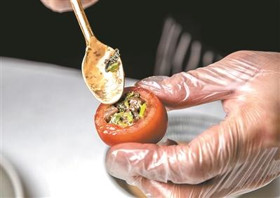 把香椿牛肉放进西红柿里。