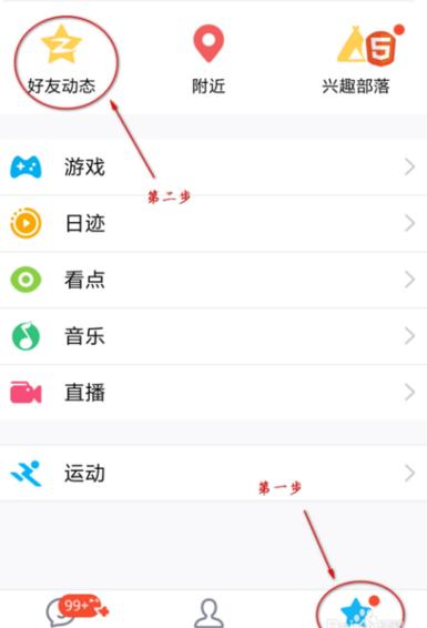 3.打开手机QQ,点击底部菜单栏动态,再点击上面的好友动态,进入QQ空房间。操作如图所示。