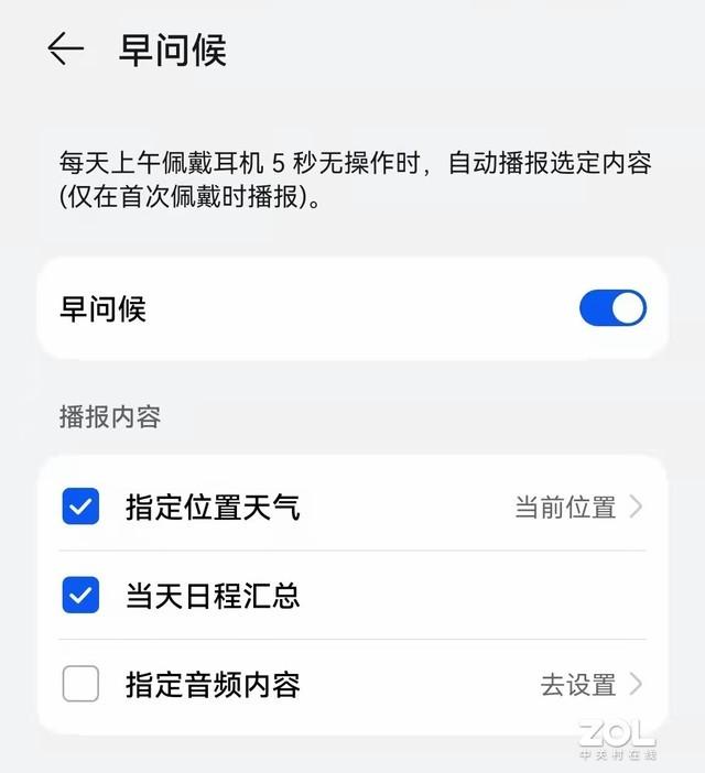 首先,耳机会广播当前位置的天气信息。如果日历中设定了日程安排,耳机还会播放今天的日程安排。最后,用户可以指定音频内容。不过目前只支持华为音乐和互联网华为电台,不支持第三方的APP调用。