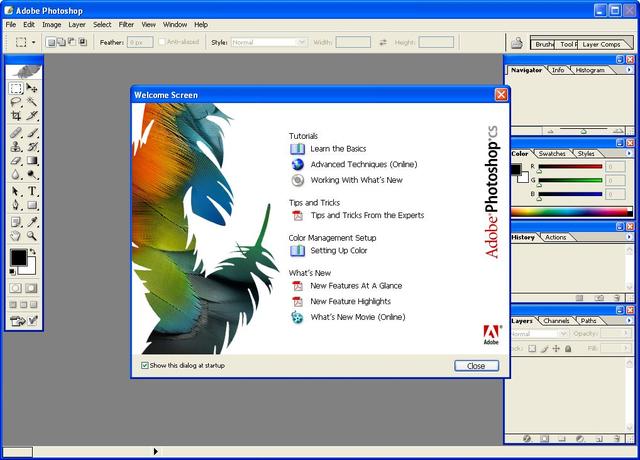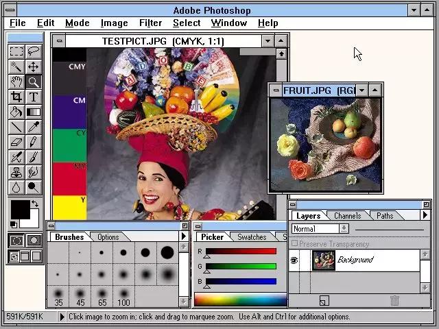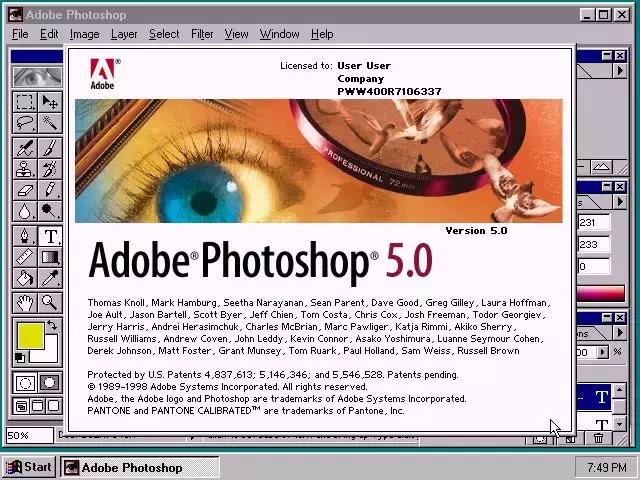 支持windows系统的PS 2.5版本,边框和启动页面终于多了一些颜色。通道、笔刷和蒙版在这个版本中都是定性的,高光和淡入淡出工具也诞生在这个版本中。
