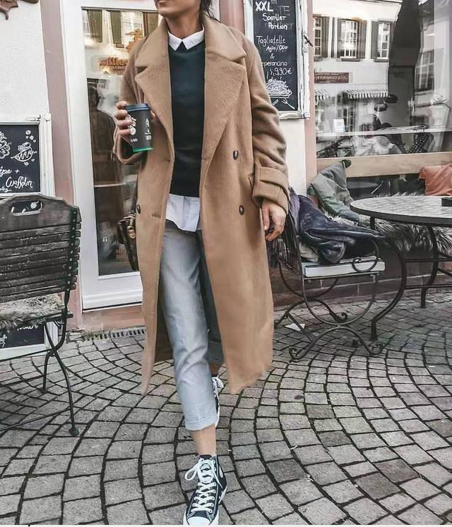 大衣可以搭配一双帆布鞋,轻便舒适。