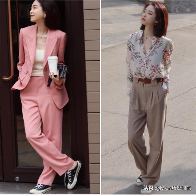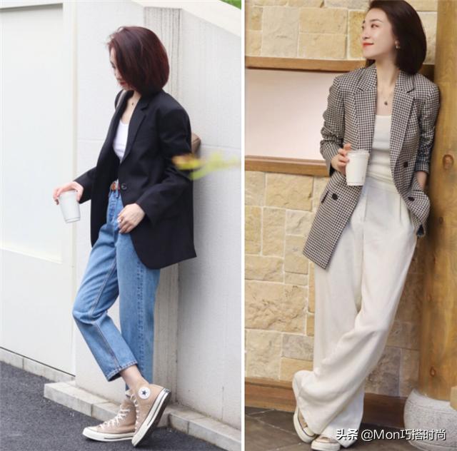 牛仔的阔腿裤和西装的阔腿裤适合这种休闲的匡威靴。款式简单休闲,看起来还是很有利于减龄的。但是,裤子的长度要根据自己的身材来选择。当然短一点的更适合九分,腿粗腿长的女生很适合拖把长的。