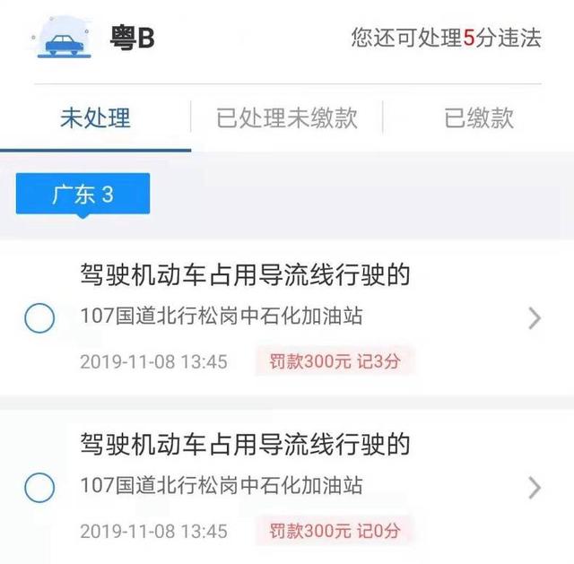 如下图,2019年11月8日广东深圳一车主违章。前后两次查询结果中,最新一次查询已经显示只罚款300元,没有扣分。
