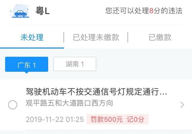 广东惠州的另一位车主也因为在深圳闯红灯被罚款500元,没有扣分。