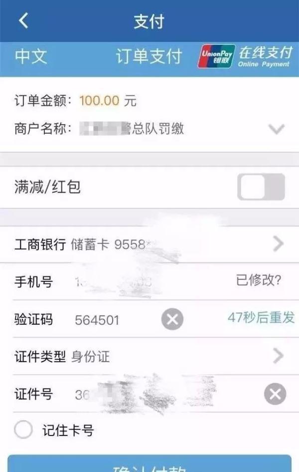 11.输入相关银行卡信息和验证码后确认支付;(目前可以交罚款的银行有五家,分别是工商、农业、建设、乌鲁木齐。建议乌鲁木齐银行可以加快违规处理速度,节省时间。)