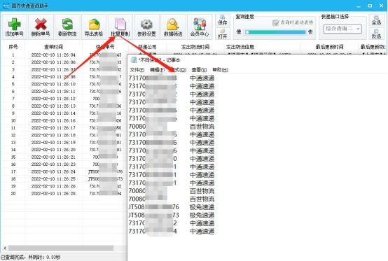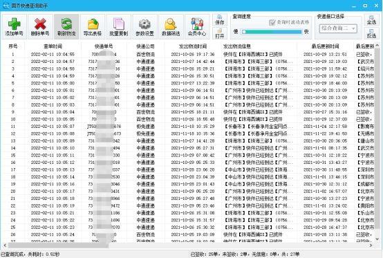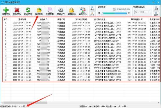 4.软件会自动开始查询,非常快,不到一秒钟。整个物流细节都是完整的。您可以通过导出表单将表单导出到本地存储,以防止数据丢失。
