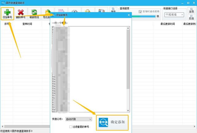 选择接口后,单击“添加否”在页面的左上角,复制courierNo。要查询的,逐个粘贴到文本框中,粘贴后点击“确定添加”,查询开始。
