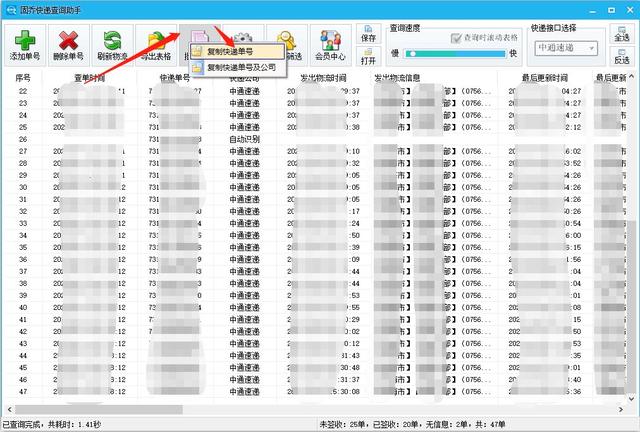 物流信息查询完毕后,我们会复制快递单号,点击页面顶部的“批量复制”,然后选择复制快递单号,即可复制快递单号。