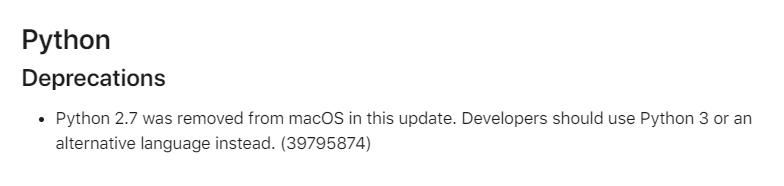 在macOS 12.3发布的发布公告中,苹果已经正式移除了Python 2.7代码,并建议用户选择Python 3或其他编程语言代替。
