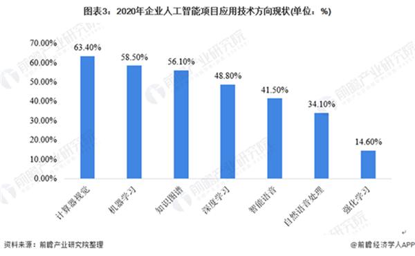 根据前瞻产业研究,2020年,企业应用最广泛的AI项目技术是计算机视觉,占比63.4%,其次是机器学习,占比58.5%。在国内,计算机视觉领域已经涌现出一批领先的独角兽公司,如商汤科技、旷视科技、深蓝科技、易图科技、从云科技等。