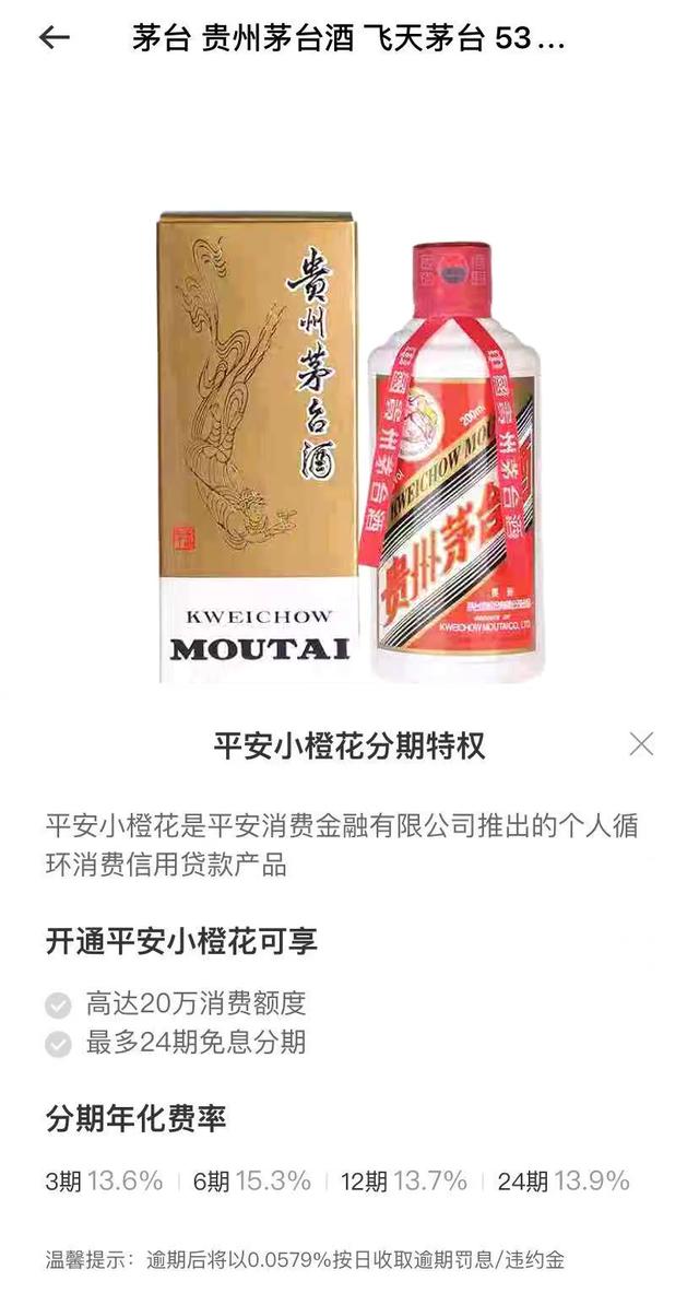 目前平安消费金融商城商品不够,但有一些高端美妆产品和白酒。用户在选择商品支付方式时,除了微信和支付宝,还可以使用平安小橙花支付。以一瓶200ml的53度飞天茅台为例。分期选择平安小橙花,每期可低至69.62元。