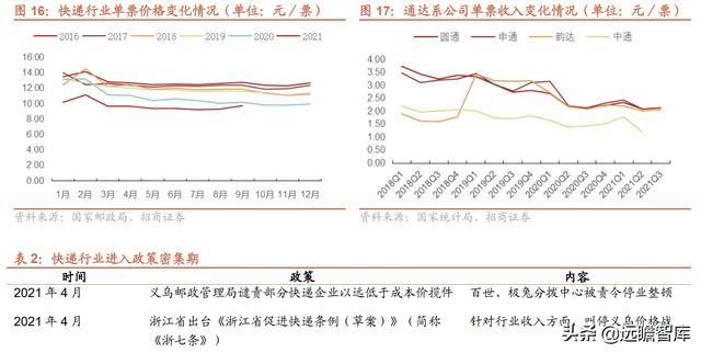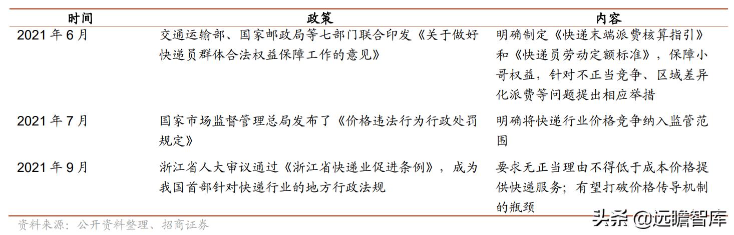 2021年,行业监管政策频繁出台,控制恶性价格竞争,提高终端快递员收入保障,促进快递行业向价值竞争转变成为中期主旋律。