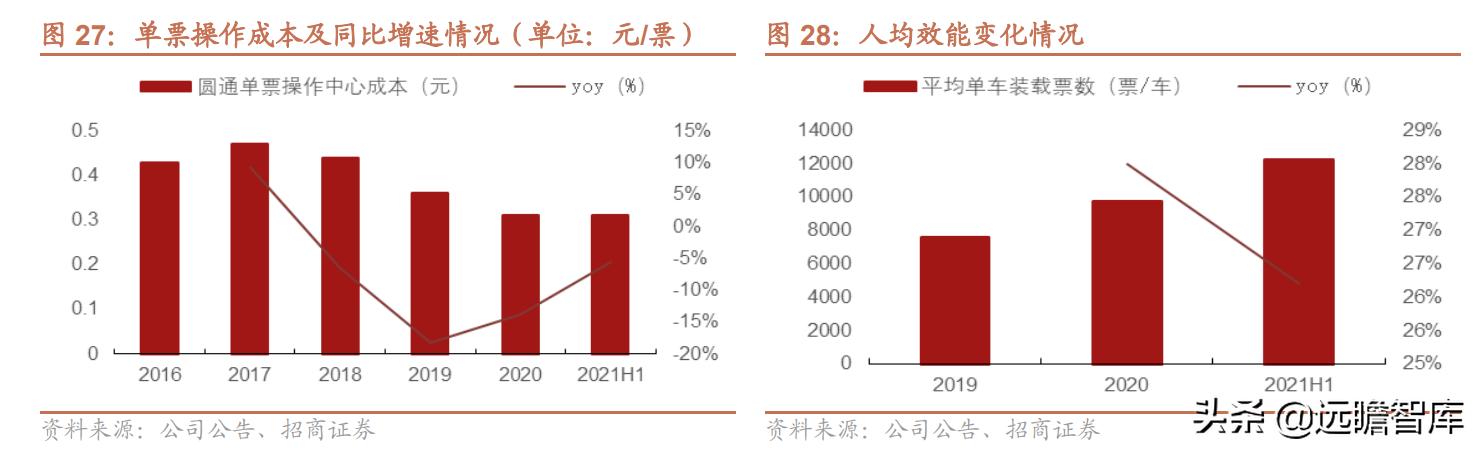 第二个“一升一降”是单票运营成本降低,人均运营效率提高。