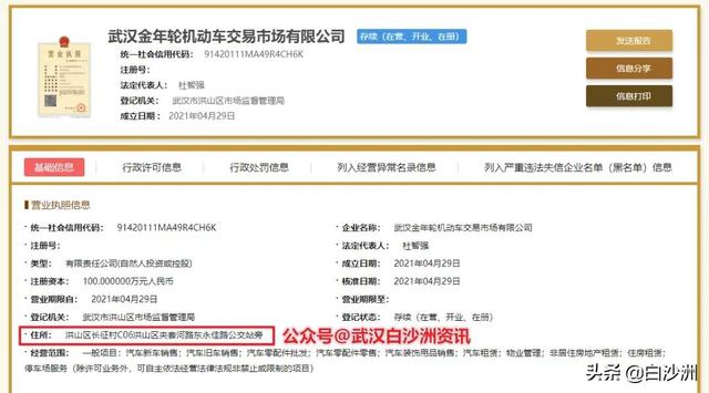 武汉金年轮机动车交易市场有限公司住所:洪山区常征村C06号贾桃河路东永佳路公交站旁,经营范围:一般项目:新车销售;二手车销售;汽车零部件批发;汽车零部件零售;汽车装饰用品的销售;租车;物业管理;非住宅房地产租赁;房屋租赁;停车服务。