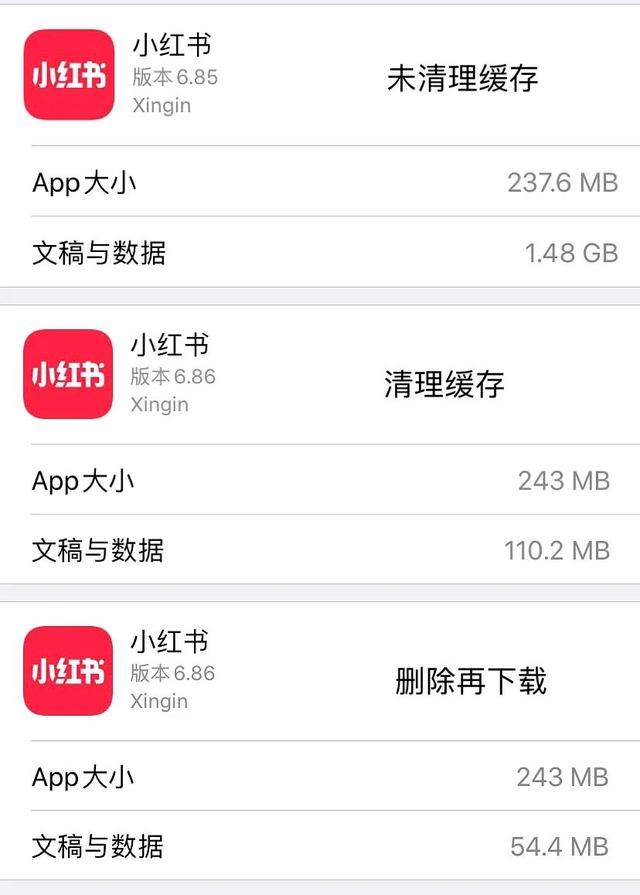 下载前清理缓存和删除小红书的对比。