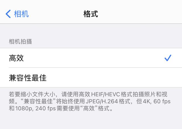 可以在“设置-相机-格式”中选择“高效”。与“最佳兼容性”相比,照片内存可节省近40%,视频可节省近一半/[k0/]。两种格式的画质差别不大,只是编码格式不同。