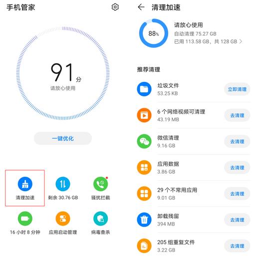 手机管家的首页有一个“清理加速”的功能。进入后,手机管家会自动扫描整理常见的内存垃圾。不同类型的垃圾可以点击进入详情页查看后再决定是否删除。删除后无法恢复。