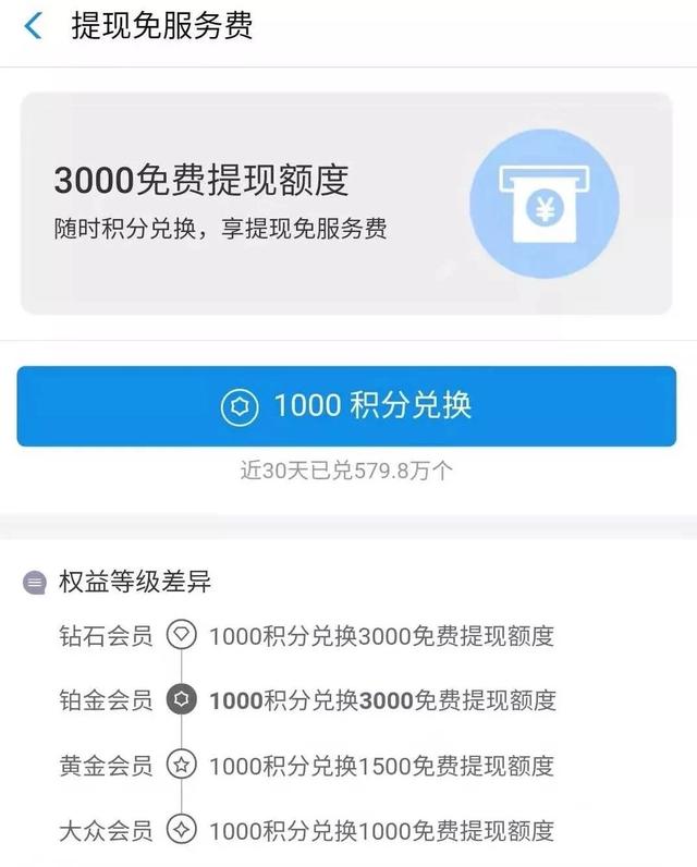至于具体的提现金额,不同的会员有不同的档次。大众会员的1000积分可兑换1000免费提现额度,黄金会员的1500额度可兑换,白金钻石会员的3000额度可兑换。