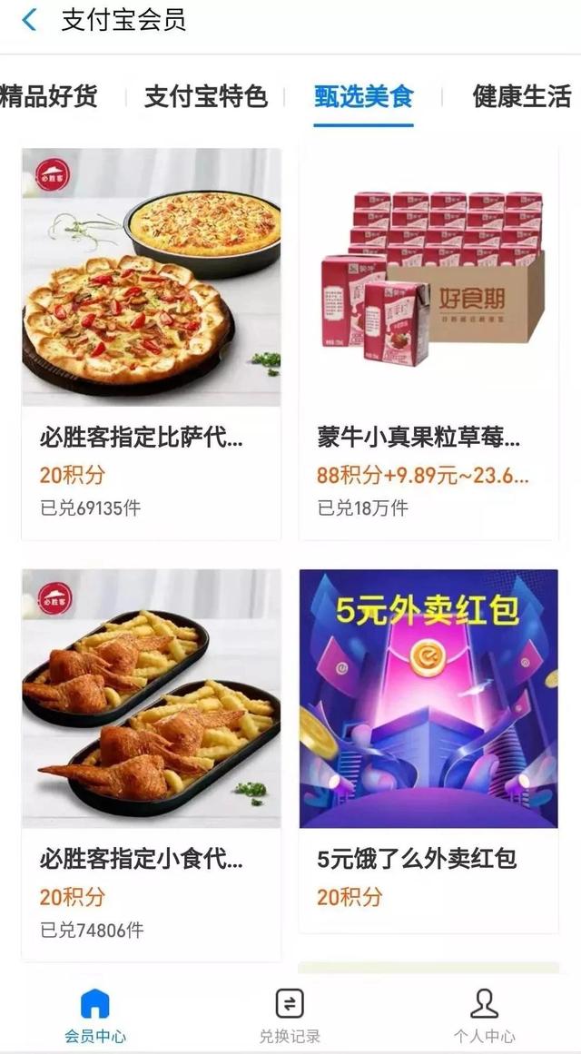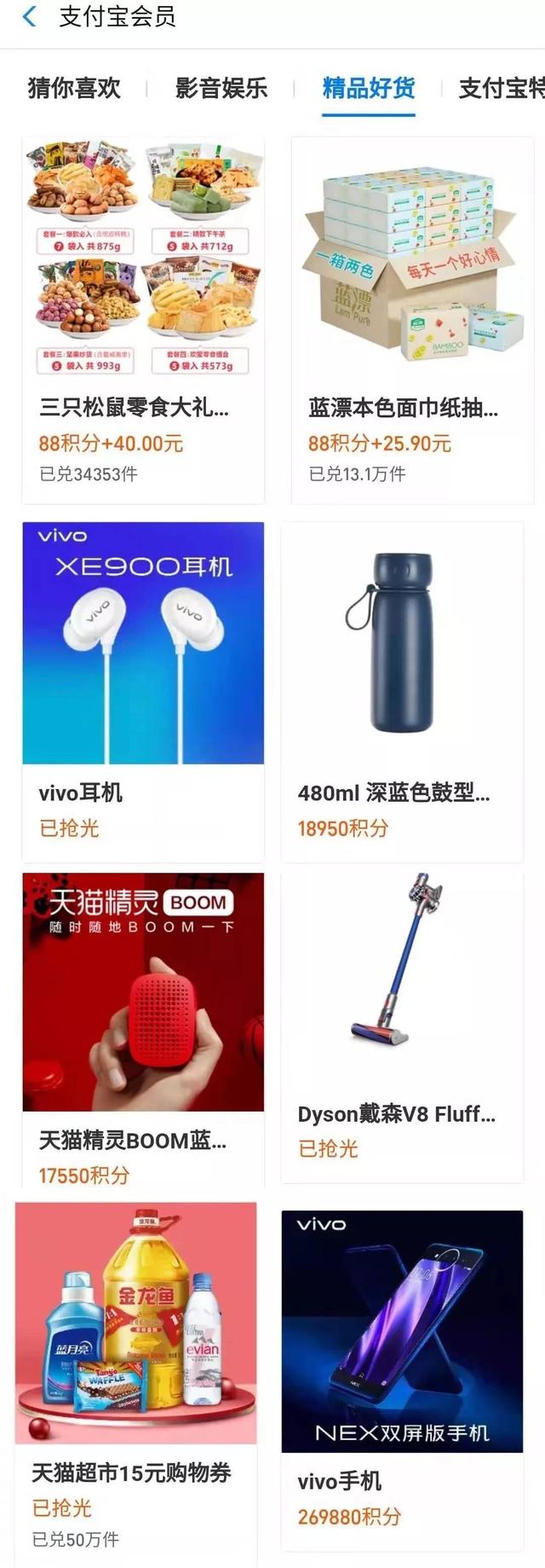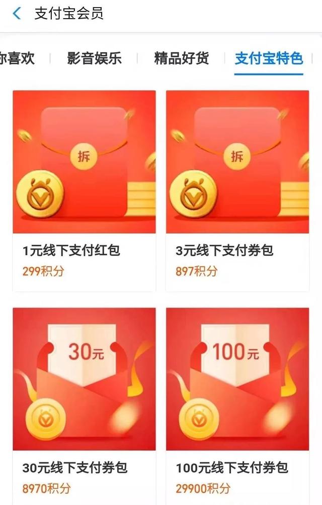 支付宝会员页面下去,可以看到各种积分兑换权益。